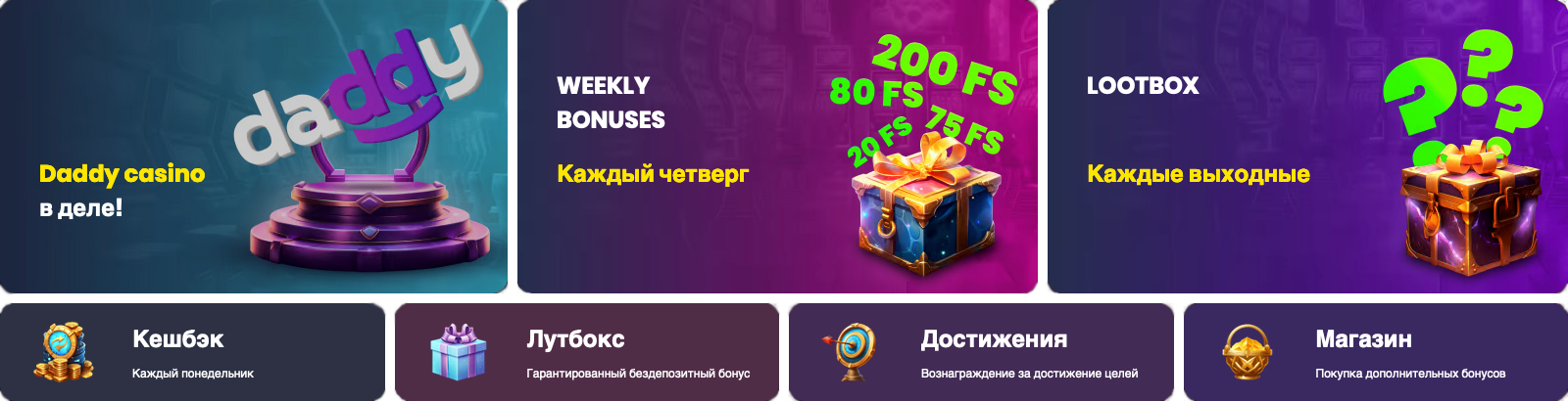 Это всего лишь часть возможностей, которые предоставляет VIP-программа. Дэдди ценит своих игроков и предоставляет им максимальный комфорт и приятные бонусы.